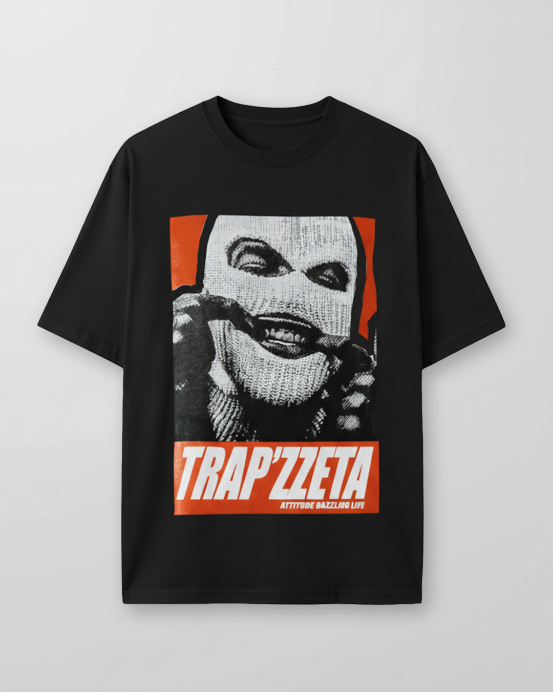 Enmarcando la fotografía, el texto “TRAP’ZZETA” en tipografía bold inclinada y el lema “ATTITUDE DAZZLING LIFE” se presentan en blanco y naranja. Sobre el fondo negro del polo, estos elementos gráficos adquieren una nitidez y una fuerza visual que capturan la mirada al instante, convirtiendo tu pecho en una declaración de principios.