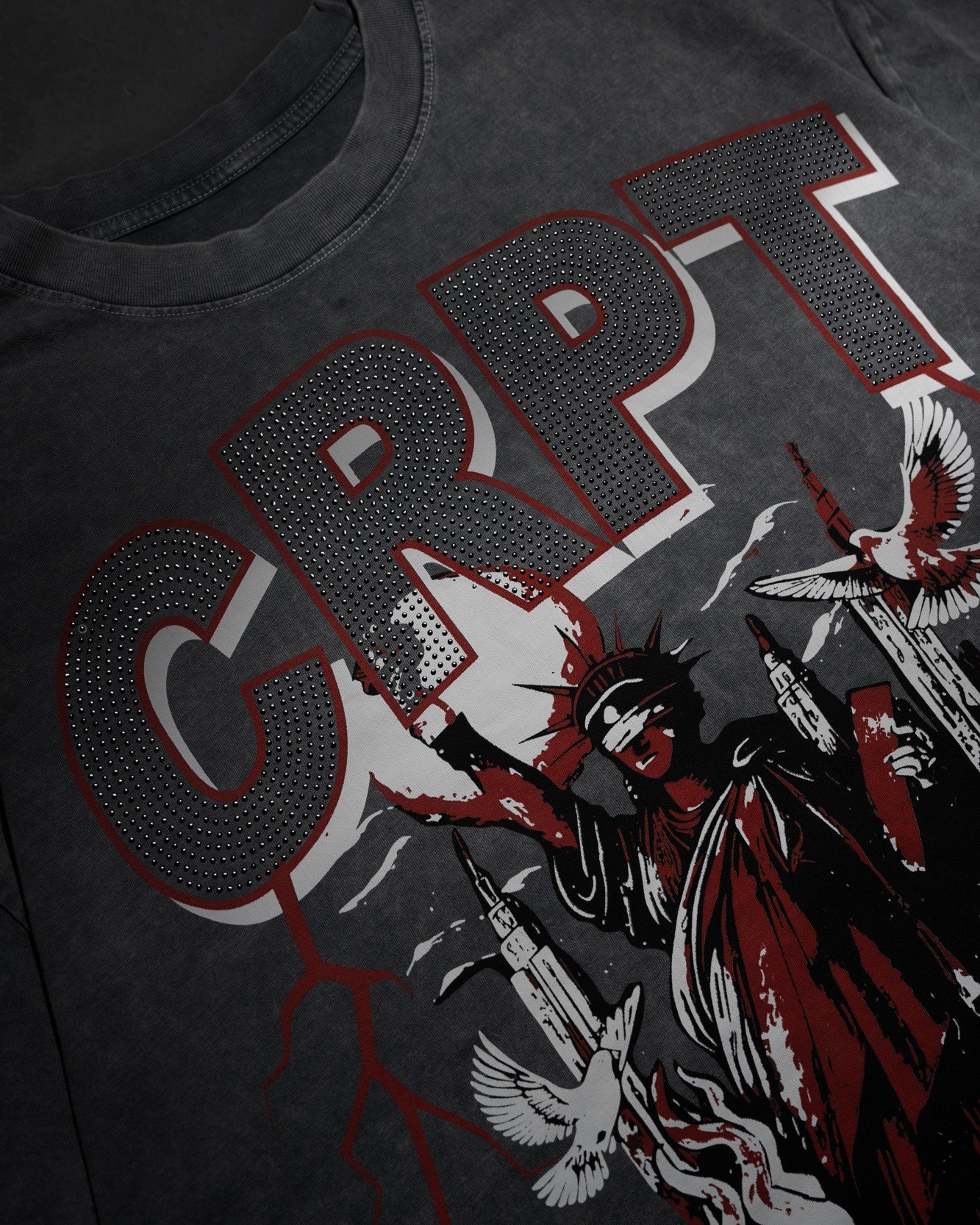 Detalle de Lujo (Strass Negro): Incorpora strass de costura con piedras en color negro brillante que se integran en las letras “CRPT”, aportando una dimensión de brillo sutil y sofisticado que resalta bajo la luz.